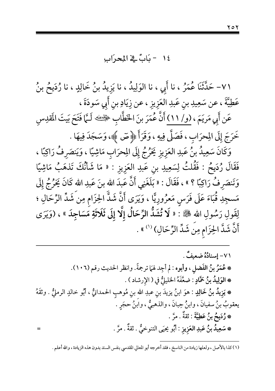 وَكَانَ سَعِيدُ بنُ عَبدِ العَزِيزِ يَخرُجُ إِلَى المِحرَابِ مَاشِيًا، وَيَنصَرِفُ رَاكِبًا، فَقَالَ رُدَيحُ: فَقُلتُ لِسَعِيدِ بنِ عَبدِ العَزِيزِ: «مَا شَأنُكَ تَذهَبُ مَاشِيًا وَتَنصَرِفُ رَاكِبًا؟»، فَقَالَ: «بَلَغَنِي أَنَّ عَبدَ اللهِ بنَ عَبدِ اللهِ كَانَ يَخرُجُ إِلَى مَسجِدِ قُبَاءَ عَلَى فَرَسٍ مَعرُورِيًّا، وَيَرَى أَنَّ شَدَّ الحِزَامِ مِن شَدِّ الرِّحَالِ؛ لِقَولِ رَسُولِ اللهِ - صلى الله عليه وسلم -: «لَا تُشَدُّ الرِّحَالُ إِلَّا إِلَى ثَلَاثَةِ مَسَاجِدَ»، (وَيَرَى أَنَّ شَدَّ الحِزَامِ مِن شَدِّ الرِّحَالِ) (¬١)».