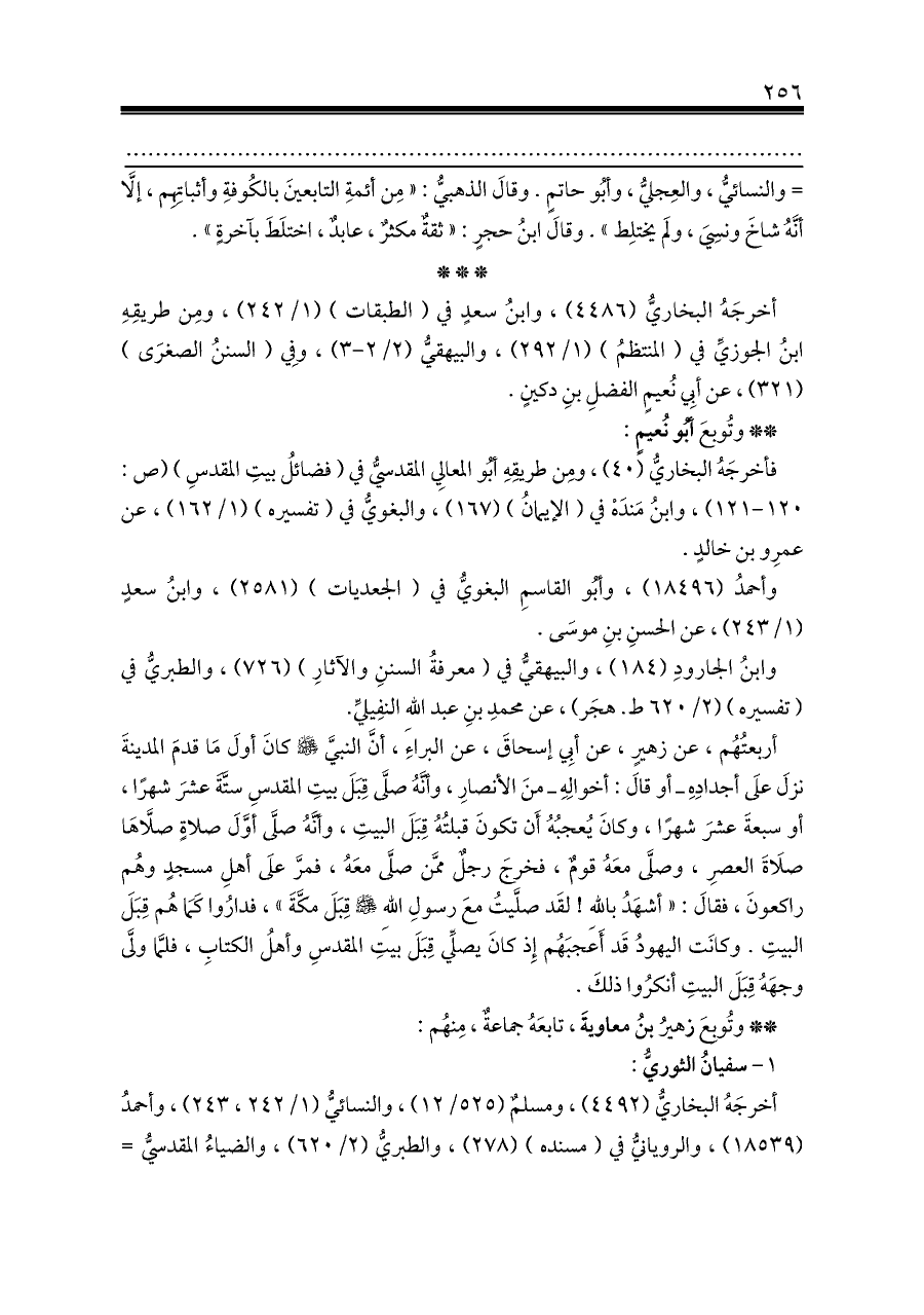 أربعتُهُم، عن زهيرٍ، عن أبِي إسحاقَ، عن البراءِ، أنَّ النبيَّ - صلى الله عليه وسلم - كانَ أولَ مَا قدمَ المدينةَ نزلَ علَى أجدادِهِ ـ أو قالَ: أخوالِهِ ـ منَ الأنصارِ، وأنَّهُ صلَّى قِبَلَ بيتِ المقدسِ ستَّةَ عشرَ شهرًا، أو سبعةَ عشرَ شهرًا، وكانَ يُعجبُهُ أَن تكونَ قبلتُهُ قِبَلَ البيتِ، وأنَّهُ صلَّى أوَّلَ صلاةٍ صلَّاهَا صلَاةَ العصرِ، وصلَّى معَهُ قومٌ، فخرجَ رجلٌ ممَّن صلَّى معَهُ، فمرَّ علَى أهلِ مسجدٍ وهُم راكعونَ، فقالَ: «أشهَدُ باللهِ! لقَد صلَّيتُ معَ رسولِ اللهِ - صلى الله عليه وسلم - قِبَلَ مكَّةَ»، فدارُوا كَمَا هُم قِبَلَ البيتِ. وكانَت اليهودُ قَد أَعجبَهُم إِذ كانَ يصلِّي قِبَلَ بيتِ المقدسِ وأهلُ الكتابِ، فلمَّا ولَّى وجهَهُ قِبَلَ البيتِ أنكرُوا ذلكَ.