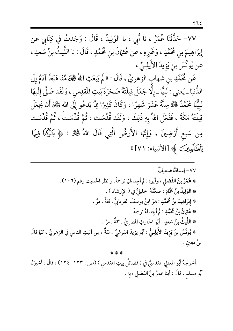 ٧٧ - حَدَّثَنَا عُمَرُ، نا أَبِي، نا الوَلِيدُ، قَالَ: وَجَدتُ في كِتَابِي عن إِبرَاهِيمَ بنِ مُحَمَّدٍ، وَغَيرِهِ، عن عُثمَانَ بنِ مُحَمَّدٍ، قَالَ: نا اللَّيثُ بنُ سَعدٍ، عن يُونُسَ بنِ يَزِيدَ الأَيلِيِّ،
