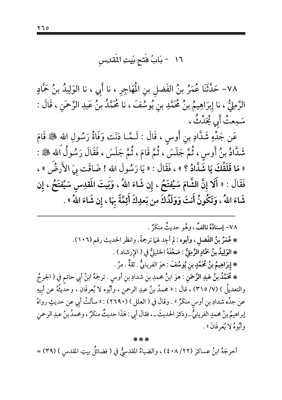 أخرجَهُ ابنُ عساكرَ (٢٢/ ٤٠٨)، والضياءُ المقدسيُّ في (فضائلُ بيتِ المقدسِ) (٣٩) =