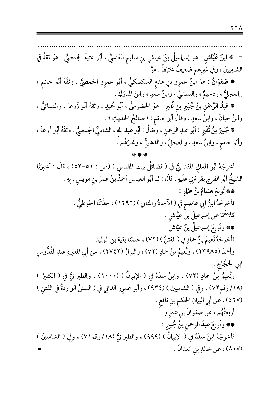 فأخرجَهُ ابنُ مندَهْ في (الإيمانُ) (٩٩٩)، والطبرانيُّ (١٨/رقم ٧١)، وفِي (الشاميينَ) (٨٠٧)، عن خالدِ بنِ مَعدانَ. ... =
