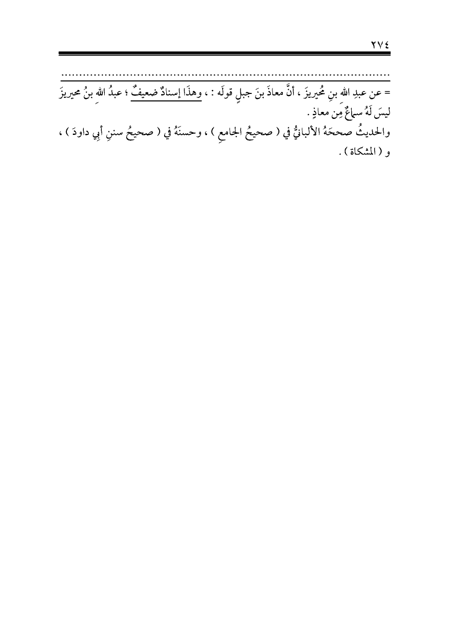 = عن عبدِ اللهِ بنِ مُحيريزَ، أنَّ معاذَ بنَ جبلٍ قولَه:، وهذَا إسنادٌ ضعيفٌ؛ عبدُ اللهِ بنُ محيريزَ ليسَ لَهُ سماعٌ مِن معاذٍ.