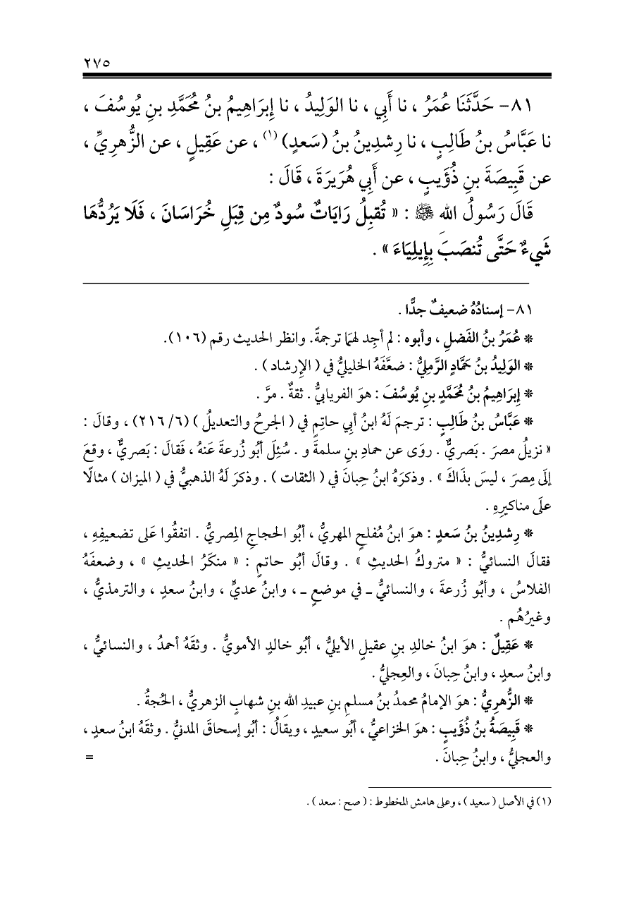 ٨١ - حَدَّثَنَا عُمَرُ، نا أَبِي، نا الوَلِيدُ، نا إِبرَاهِيمُ بنُ مُحَمَّدِ بنِ يُوسُفَ، نا عَبَّاسُ بنُ طَالِبٍ، نا رِشدِينُ بنُ (سَعدٍ) (¬١)، عن عَقِيلٍ، عن الزُّهرِيِّ، عن قَبِيصَةَ بنِ ذُؤَيبٍ، عن أَبِي هُرَيرَةَ، قَالَ: