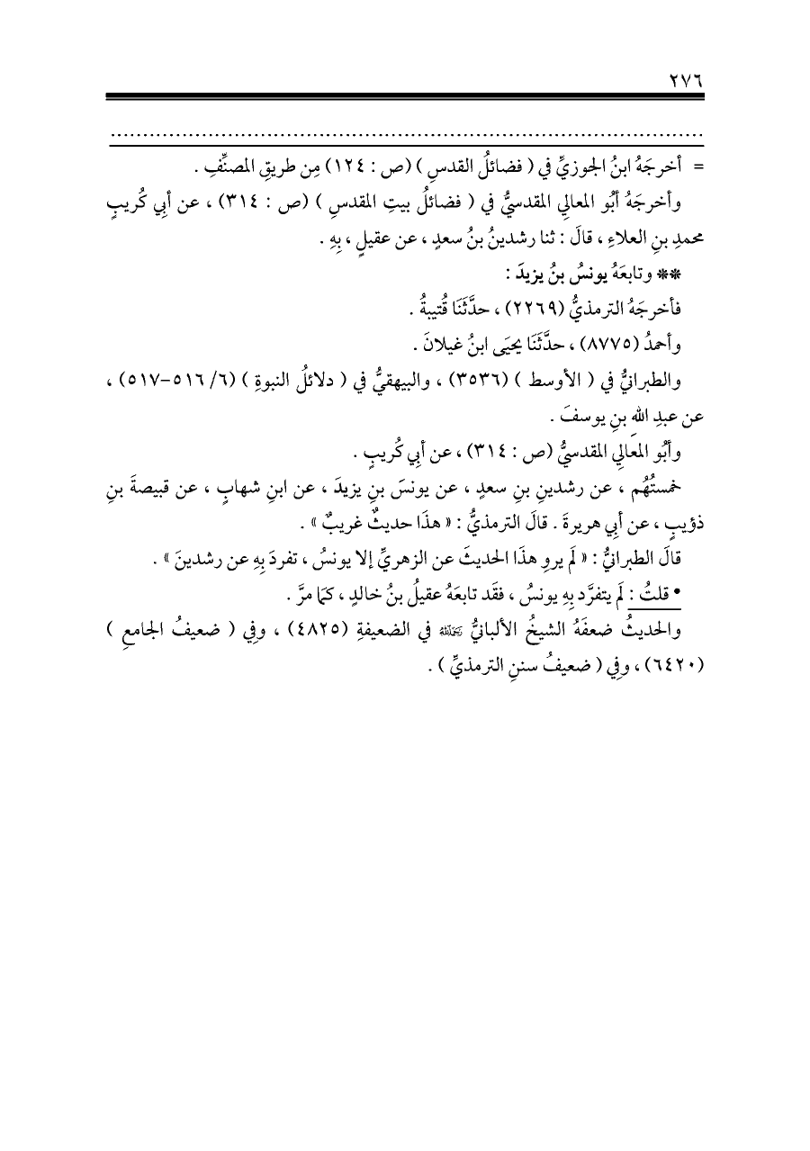 وأخرجَهُ أبُو المعالِي المقدسيُّ في (فضائلُ بيتِ المقدسِ) (ص: ٣١٤)، عن أبِي كُريبٍ محمدِ بنِ العلاءِ، قالَ: ثنا رشدينُ بنُ سعدٍ، عن عقيلٍ، بِهِ.