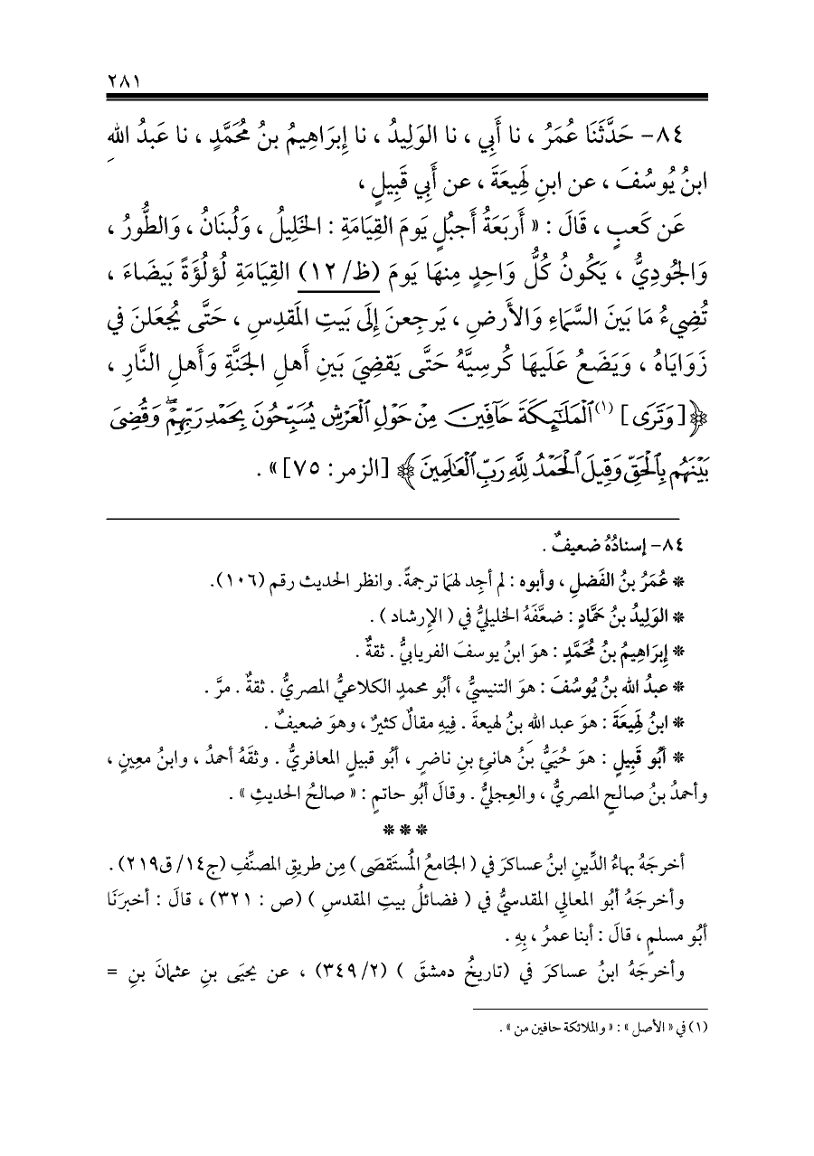 ٨٤ - حَدَّثَنَا عُمَرُ، نا أَبِي، نا الوَلِيدُ، نا إِبرَاهِيمُ بنُ مُحَمَّدٍ، نا عَبدُ اللهِ ابنُ يُوسُفَ، عن ابنِ لَهِيعَةَ، عن أَبِي قَبِيلٍ،