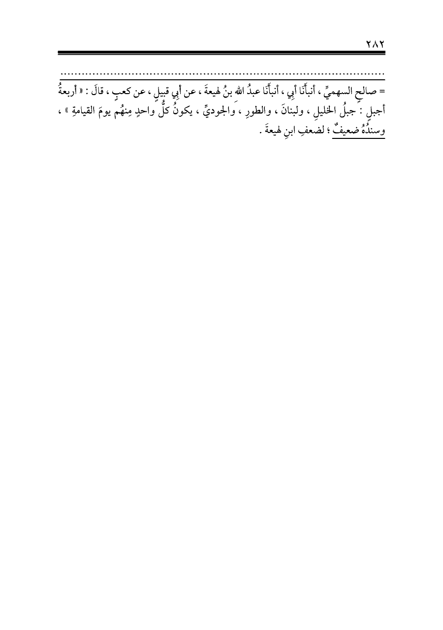 = صالحٍ السهميِّ، أنبأَنَا أبِي، أنبأَنَا عبدُ اللهِ بنُ لهيعةَ، عن أبِي قبيلٍ، عن كعبٍ، قالَ: «أربعةُ أجبلٍ: جبلُ الخليلِ، ولبنانَ، والطورِ، والجوديِّ، يكونُ كلُّ واحدٍ مِنهُم يومَ القيامةِ»، وسندُهُ ضعيفٌ؛ لضعفِ ابنِ لهيعةَ.