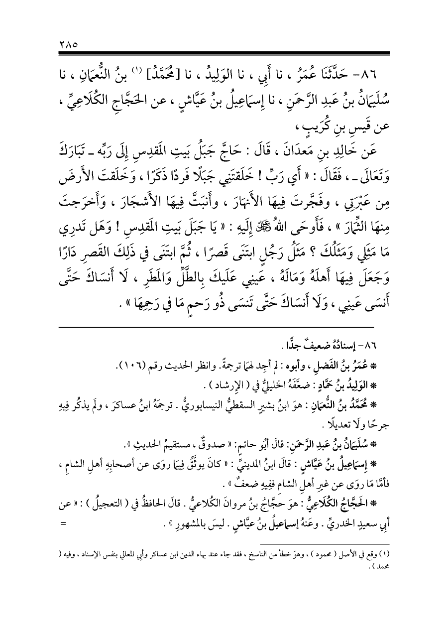٨٦ - حَدَّثَنَا عُمَرُ، نا أَبِي، نا الوَلِيدُ، نا [مُحَمَّدُ] (¬١) بنُ النُّعمَانِ، نا سُلَيمَانُ بنُ عَبدِ الرَّحمَنِ، نا إِسمَاعِيلُ بنُ عَيَّاشٍ، عن الحَجَّاجِ الكُلَاعِيِّ، عن قَيسِ بنِ كُرَيبٍ،