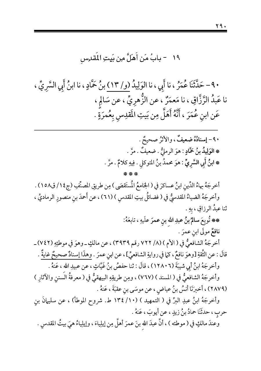 ٩٠ - حَدَّثَنَا عُمَرُ، نا أَبِي، نا الوَلِيدُ (و/١٣) بنُ حَمَّادٍ، نا ابنُ أَبِي السَّرِيِّ، نا عَبدُ الرَّزَّاقِ، نا مَعمَرٌ، عن الزُّهرِيِّ، عن سَالِمٍ،