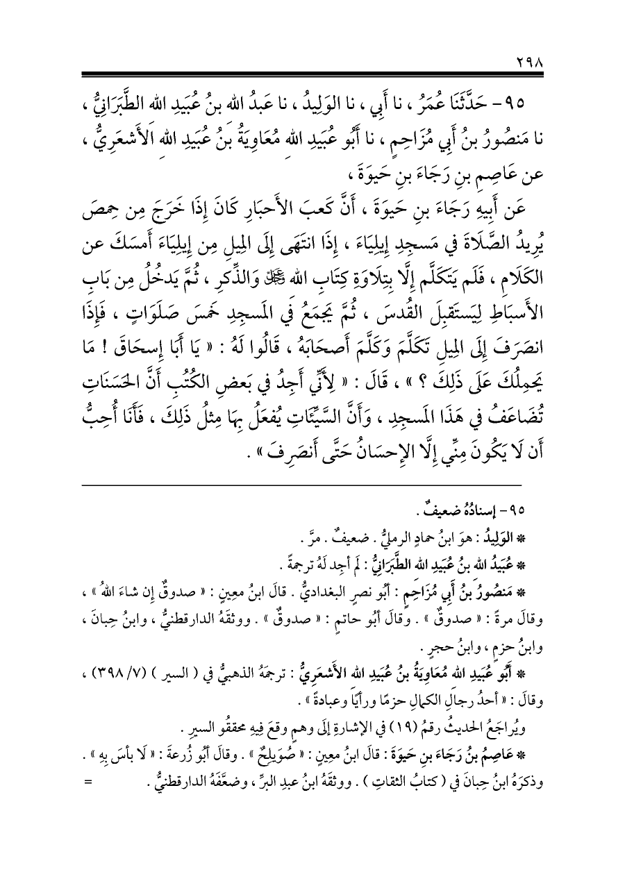 ٩٥ - حَدَّثَنَا عُمَرُ، نا أَبِي، نا الوَلِيدُ، نا عَبدُ اللهِ بنُ عُبَيدِ اللهِ الطَّبَرَانِيُّ، نا مَنصُورُ بنُ أَبِي مُزَاحِمٍ، نا أَبُو عُبَيدِ اللهِ مُعَاوِيَةُ بنُ عُبَيدِ اللهِ الأَشعَرِيُّ، عن عَاصِمِ بنِ رَجَاءَ بنِ حَيوَةَ،