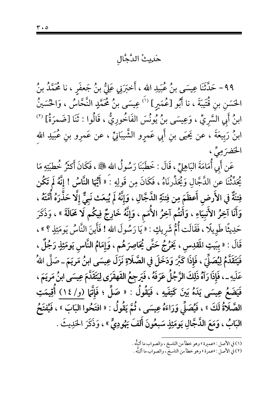 عَن أَبِي أُمَامَةَ البَاهِلِيِّ، قَالَ: خَطَبَنَا رَسُولُ اللهِ - صلى الله عليه وسلم -، فَكَانَ أَكثَرُ خُطبَتِهِ مَا يُحَدِّثُنَا عن الدَّجَّالِ وَيُحَذِّرنَاهُ، فَكَانَ مِن قَولِهِ: «أَيُّهَا النَّاسُ! إِنَّهُ لَم تَكُن فِتنَةٌ في الأَرضِ أَعظَمَ مِن فِتنَةِ الدَّجَّالِ، وَإِنَّهُ لَم يُبعَث نَبِيٌّ إِلَّا حَذَّرَهُ أُمَّتَهُ، وَأَنَا آخِرُ الأَنبِيَاءِ، وَأَنتُم آخِرُ الأُمَمِ، وَإِنَّهُ خَارِجٌ فِيكُم لَا مَحَالَةَ»، وَذَكَرَ حَدِيثًا طَوِيلًا، فَقَالَت أُمُّ شَرِيكٍ: «يَا رَسُولَ اللهِ! فَأَينَ النَّاسُ يَومَئِذٍ؟»، قَالَ: «بِبَيتِ المَقدِسِ، يَخرُجُ حَتَّى يُحَاصِرَهُم، وَإِمَامُ النَّاسِ يَومَئِذٍ رَجُلٌ، فَيَتَقَدَّمُ لِيُصَلِّيَ، فَإِذَا كَبَّرَ وَدَخَلَ في الصَّلَاةِ نَزَلَ عِيسَى ابنُ مَريَمَ ـ صَلَّى اللهُ عَلَيهِ ـ، فَإِذَا رَآهُ ذَلِكَ الرَّجُلُ عَرَفَهُ، فَيَرجِعُ القَهقَرَى لِيَتَقَدَّمَ عِيسَى ابنُ مَريَمَ، فَيَضَعُ عِيسَى يَدَهُ بَينَ كَتِفَيهِ، فَيَقُولُ: «صَلِّ؛ فَإِنَّمَا (و/١٤) أُقِيمَتِ الصَّلَاةُ لَكَ»، فَيُصَلِّي وَرَاءَهُ عِيسَى، ثُمَّ يَقُولُ: «افتَحُوا البَابَ»، فَيُفتَحُ البَابُ، وَمَعَ الدَّجَّالِ يَومَئِذٍ سَبعُونَ أَلفَ يَهُودِيٍّ»، وَذَكَرَ الحَدِيثَ.