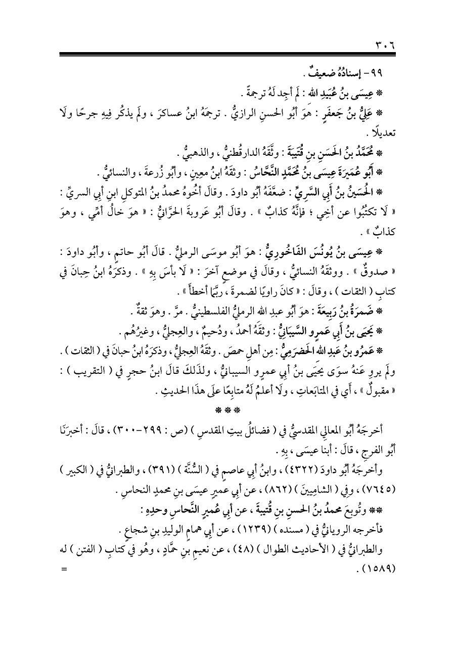 * أَبُو عُمَيرَةَ عِيسَى بنُ مُحَمَّدٍ النَّحَّاسُ: وثقَهُ ابنُ معِينٍ، وأبُو زُرعةَ، والنسائيُّ.