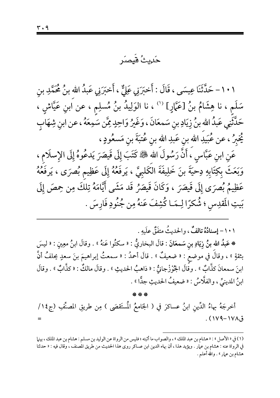 ١٠١ - حَدَّثَنَا عِيسَى، قَالَ: أَخبَرَنِي عَلِيٌّ، أَخبَرَنِي عَبدُ اللهِ بنُ مُحَمَّدِ بنِ سَلَمٍ، نا هِشَامُ بنُ [عَمَّارٍ] (¬١)، نا الوَلِيدُ بنُ مُسلِمٍ، عن ابنِ عَيَّاشٍ، حَدَّثَنِي عَبدُ اللهِ بنُ زِيَادِ بنِ سَمعَانَ، وَغَيرُ وَاحِدٍ مِمَّن سَمِعَهُ، عن ابنِ شِهَابٍ يُخبِرُ، عن عُبَيدِ اللهِ بنِ عَبدِ اللهِ بنِ عُتبَةَ بنِ مَسعُودٍ،