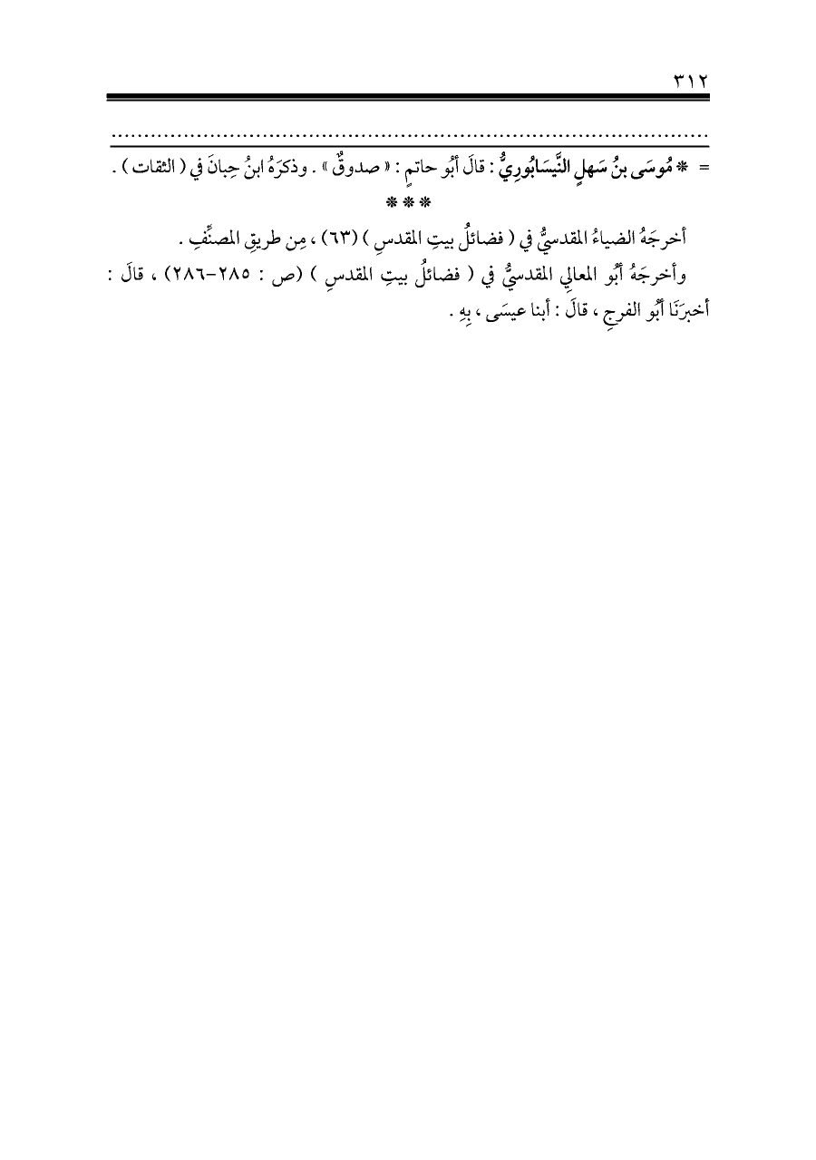 = * مُوسَى بنُ سَهلٍ النَّيسَابُورِيُّ: قالَ أبُو حاتمٍ: «صدوقٌ». وذكرَهُ ابنُ حِبانَ في (الثقات).