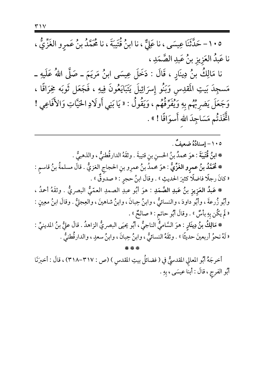 ١٠٥ - إسنادُهُ ضعيفٌ.