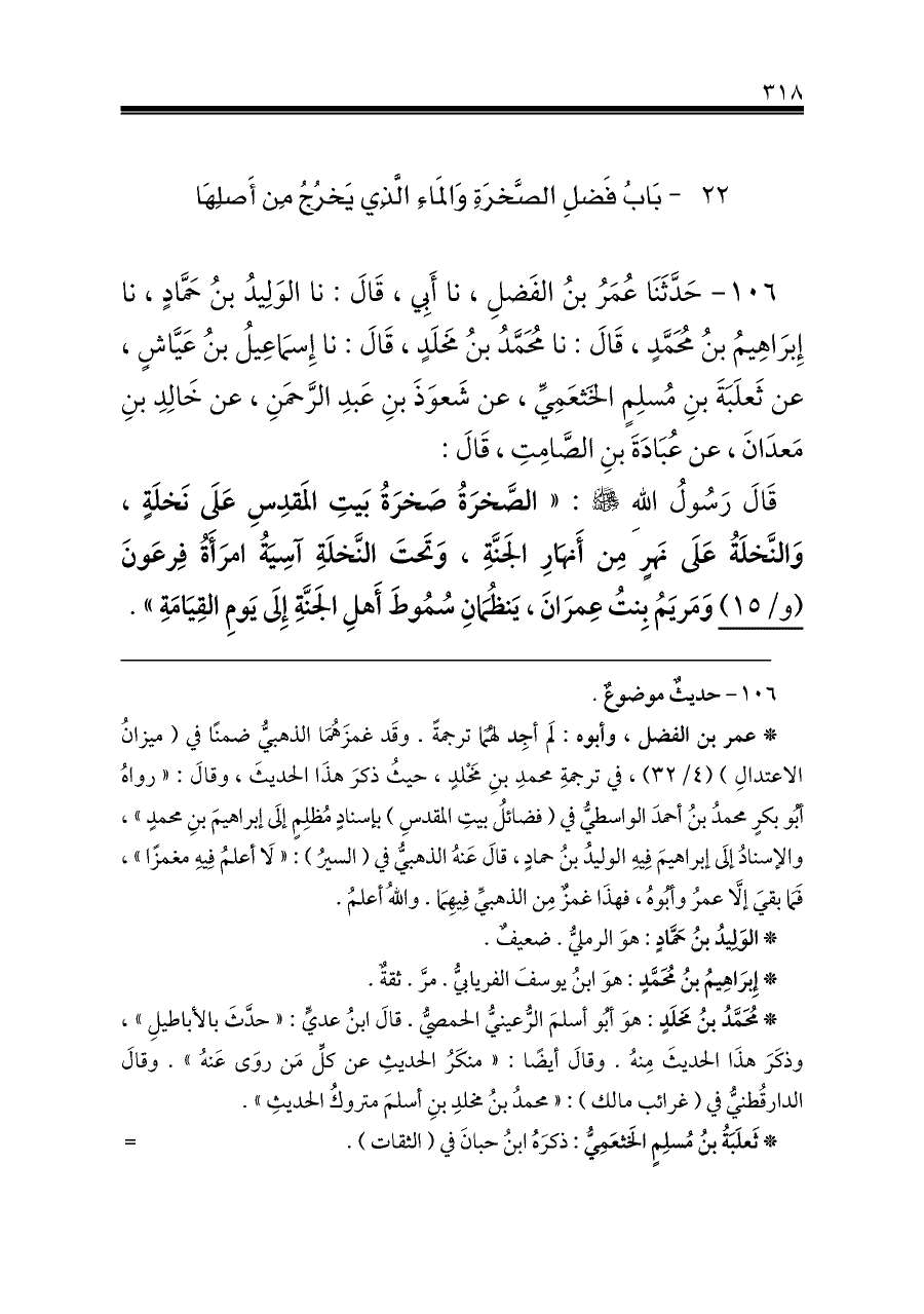 قَالَ رَسُولُ اللهِ - صلى الله عليه وسلم -: «الصَّخرَةُ صَخرَةُ بَيتِ المَقدِسِ عَلَى نَخلَةٍ، وَالنَّخلَةُ عَلَى نَهرٍ مِن أَنهَارِ الجَنَّةِ، وَتَحتَ النَّخلَةِ آسِيَةُ امرَأَةُ فِرعَونَ (و/١٥) وَمَريَمُ بِنتُ عِمرَانَ، يَنظُمَانِ سُمُوطَ أَهلِ الجَنَّةِ إِلَى يَومِ القِيَامَةِ».