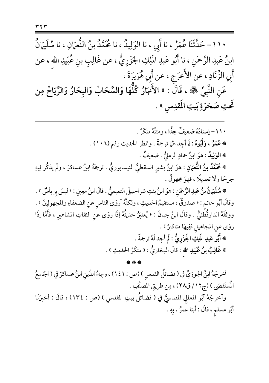 ١١٠ - حَدَّثَنَا عُمَرُ، نا أَبِي، نا الوَلِيدُ، نا مُحَمَّدُ بنُ النُّعمَانِ، نا سُلَيمَانُ ابنُ عَبدِ الرَّحمَنِ، نا أَبُو عَبدِ المَلِكِ الجَزَرِيُّ، عن غَالِبِ بنِ عُبَيدِ اللهِ، عن أَبِي الزِّنَادِ، عن الأَعرَجِ، عن أَبِي هُرَيرَةَ،