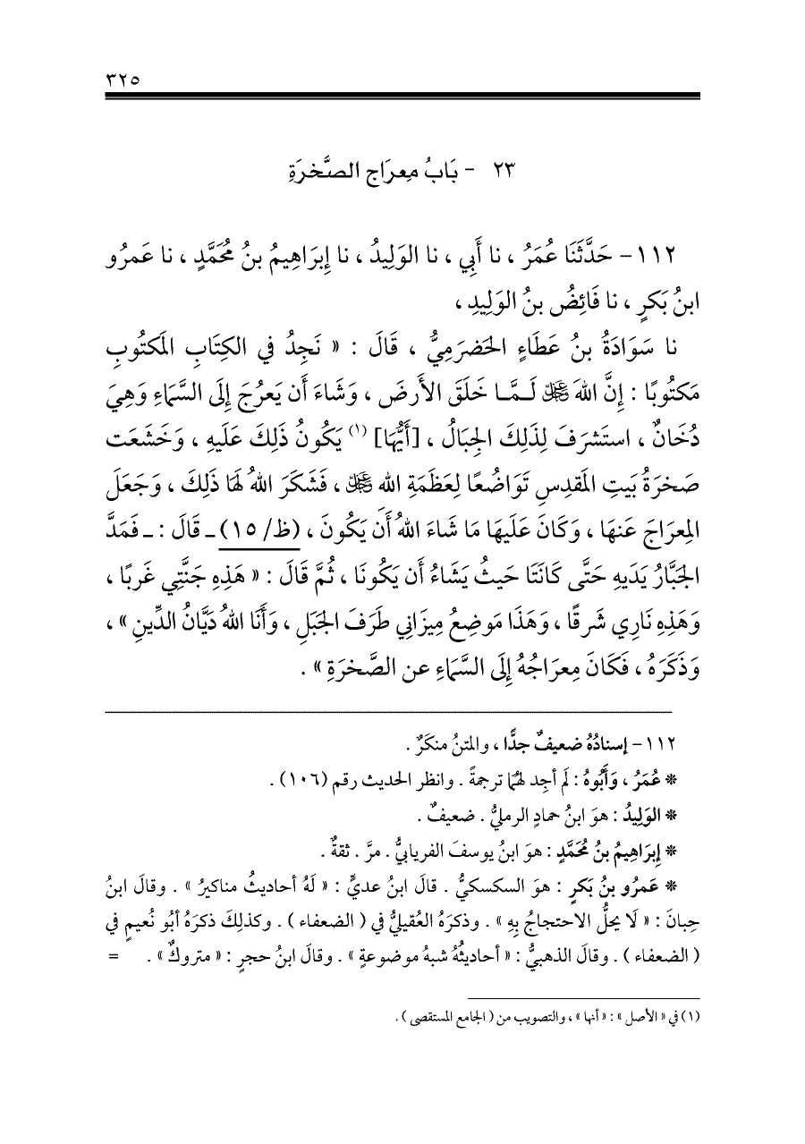 نا سَوَادَةُ بنُ عَطَاءٍ الحَضرَمِيُّ، قَالَ: «نَجِدُ في الكِتَابِ المَكتُوبِ مَكتُوبًا: إِنَّ اللهَ - عز وجل - لَمَّا خَلَقَ الأَرضَ، وَشَاءَ أَن يَعرُجَ إِلَى السَّمَاءِ وَهِيَ دُخَانٌ، استَشرَفَ لِذَلِكَ الجِبَالُ، [أَيُّهَا] (¬١) يَكُونُ ذَلِكَ عَلَيهِ، وَخَشَعَت صَخرَةُ بَيتِ المَقدِسِ تَوَاضُعًا لِعَظَمَةِ اللهِ - عز وجل -، فَشَكَرَ اللهُ لَهَا ذَلِكَ، وَجَعَلَ المِعرَاجَ عَنهَا، وَكَانَ عَلَيهَا مَا شَاءَ اللهُ أَن يَكُونَ، (ظ/١٥) ـ قَالَ: ـ فَمَدَّ الجَبَّارُ يَدَيهِ حَتَّى كَانَتَا حَيثُ يَشَاءُ أَن يَكُونَا، ثُمَّ قَالَ: «هَذِهِ جَنَّتِي غَربًا، وَهَذِهِ نَارِي شَرقًا، وَهَذَا مَوضِعُ مِيزَانِي طَرَفَ الجَبَلِ، وَأَنَا اللهُ دَيَّانُ الدِّينِ»، وَذَكَرَهُ، فَكَانَ مِعرَاجُهُ إِلَى السَّمَاءِ عن الصَّخرَةِ».
