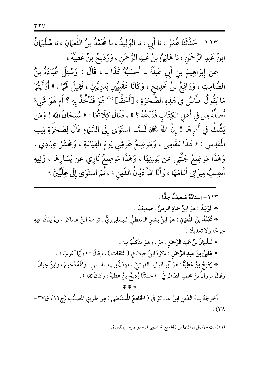 ١١٣ - إسنادُهُ ضعيفٌ جدًّا.