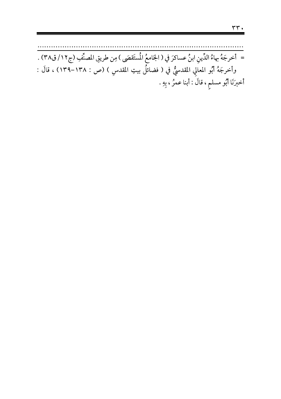= أخرجَهُ بهاءُ الدِّينِ ابنُ عساكرَ في (الجَامعُ المُستَقصَى) مِن طريقِ المصنِّفِ (ج ١٢/ق ٣٨).