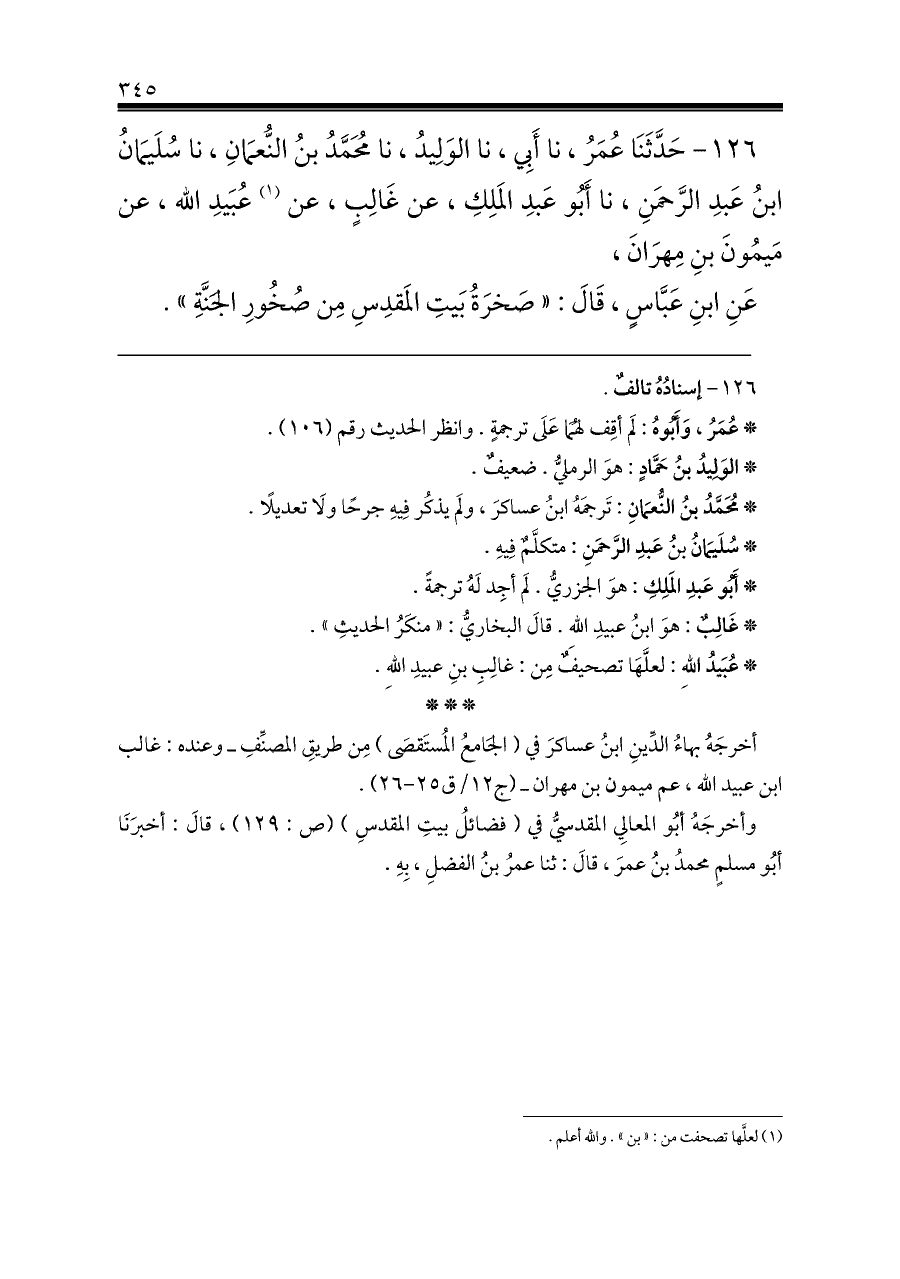 ١٢٦ - حَدَّثَنَا عُمَرُ، نا أَبِي، نا الوَلِيدُ، نا مُحَمَّدُ بنُ النُّعمَانِ، نا سُلَيمَانُ ابنُ عَبدِ الرَّحمَنِ، نا أَبُو عَبدِ المَلِكِ، عن غَالِبٍ، بن (¬١) عُبَيدِ الله، عن مَيمُونَ بنِ مِهرَانَ،