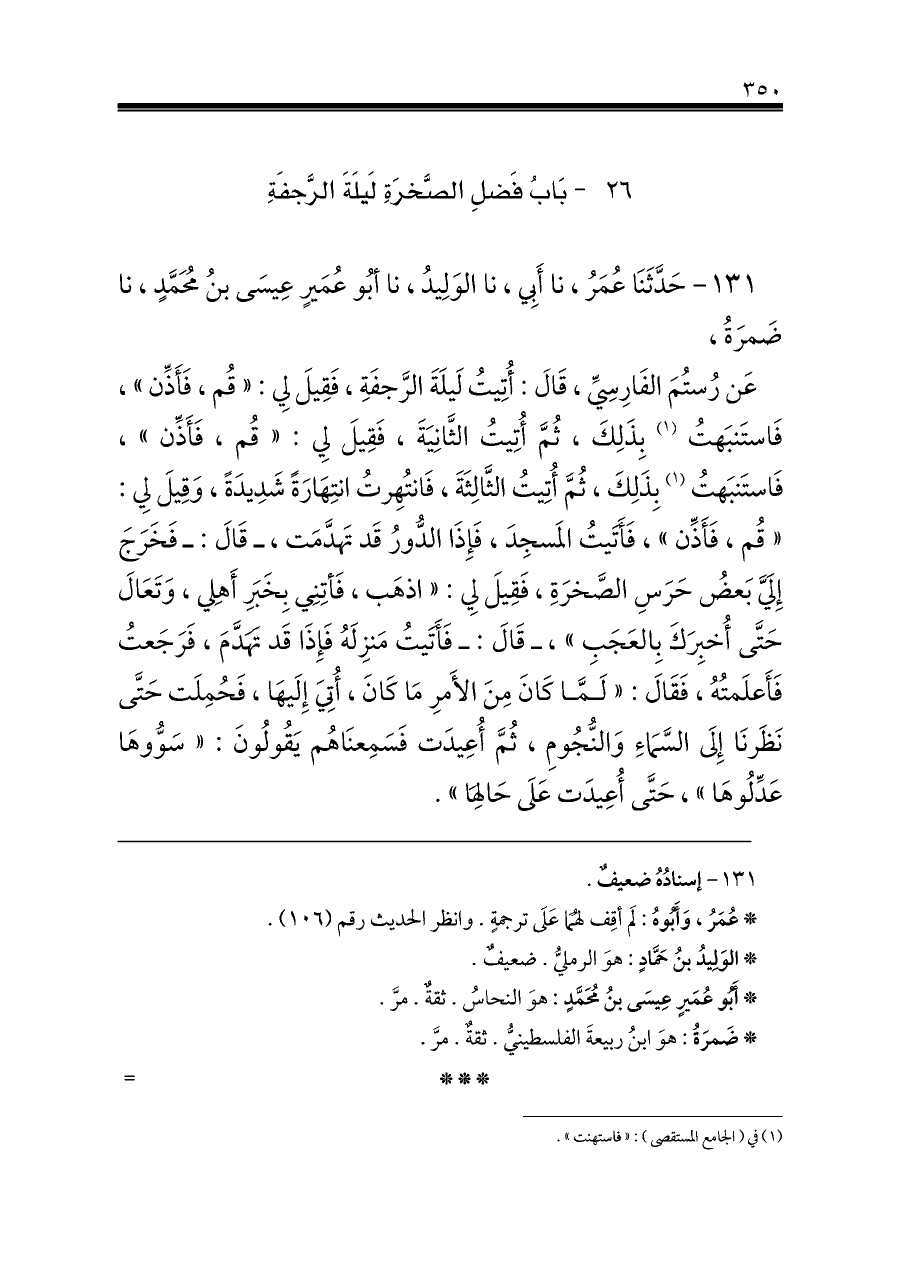 ١٣١ - حَدَّثَنَا عُمَرُ، نا أَبِي، نا الوَلِيدُ، نا أبُو عُمَيرٍ عِيسَى بنُ مُحَمَّدٍ، نا ضَمرَةُ،