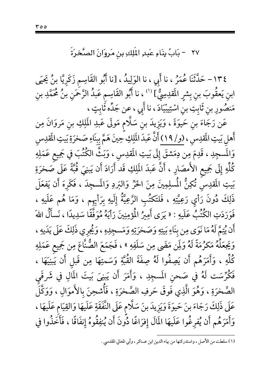عَن رَجَاءَ بنِ حَيوَةَ، وَيَزِيدَ بنِ سَلَّامٍ مَولَى عَبدِ المَلِكِ بنِ مَروَانَ مِن أَهلِ بَيتِ المَقدِسِ، (و/١٩) أَنَّ عَبدَ المَلِكِ حِينَ هَمَّ بِبِنَاءِ صَخرَةِ بَيتِ المَقدِسِ وَالمَسجِدِ، قَدِمَ مِن دِمَشقَ إِلَى بَيتِ المَقدِسِ، وَبَثَّ الكُتُبَ في جَمِيعِ عَمَلِهِ كُلِّهِ إِلَى جَمِيعِ الأَمصَارِ، أَنَّ عَبدَ المَلِكِ قَد أَرَادَ أَن يَبنِيَ قُبَّةً عَلَى صَخرَةِ بَيتِ المَقدِسِ تُكِنُّ المُسلِمِينَ مِنَ الحَرِّ وَالبَردِ وَالمَسجِدَ، فَكَرِهَ أَن يَفعَلَ ذَلِكَ دُونَ رَأيِ رَعِيَّتِهِ، فَلتَكتُبِ الرَّعِيَّةُ إِلَيهِ بِرَأيِهِم، وَمَا هُم عَلَيهِ، فَوَرَدَتِ الكُتُبُ عَلَيهِ: «يَرَى أَمِيرُ المُؤمِنِينَ رَأيَهُ مُوَفَّقًا سَدِيدًا، نَسأَلُ اللهَ أَن يُتِمَّ لَهُ مَا نَوَى مِن بِنَاءِ بَيتِهِ وَصَخرَتِهِ وَمَسجِدِهِ، وَيُجرِي ذَلِكَ عَلَى يَدَيهِ، وَيَجعَلُهُ مَكرُمَةً لَهُ وَلِمَن مَضَى مِن سَلَفِهِ»، فَجَمَعَ الصُّنَّاعَ مِن جَمِيعِ عَمَلِهِ كُلِّهِ، وَأَمَرَهُم أَن يَصِفُوا لَهُ صِفَةَ القُبَّةِ وَسَمتِهَا مِن قَبلِ أَن يَبنِيَهَا، فَكُرِّسَت لَهُ في صَحنِ المَسجِدِ، وَأَمَرَ أَن يَبنِىَ بَيتَ المَالِ في شَرقَيِ الصَّخرَةِ، وَهُوَ الَّذِي فَوقَ حَرفِ الصَّخرَةِ، فَأُشحِنَ بِالأَموَالِ، وَوَكَّلَ عَلَى ذَلِكَ رَجَاءَ بنَ حَيوَةَ وَيَزِيدَ بنَ سَلَّامٍ عَلَى النَّفَقَةِ عَلَيهَا وَالقِيَامِ عَلَيهَا، وَأَمَرَهُم أَن يُفرِغُوا عَلَيهَا المَالَ إِفرَاغًا دُونَ أَن يُنفِقُوهُ إِنفَاقًا، فَأَخَذُوا في