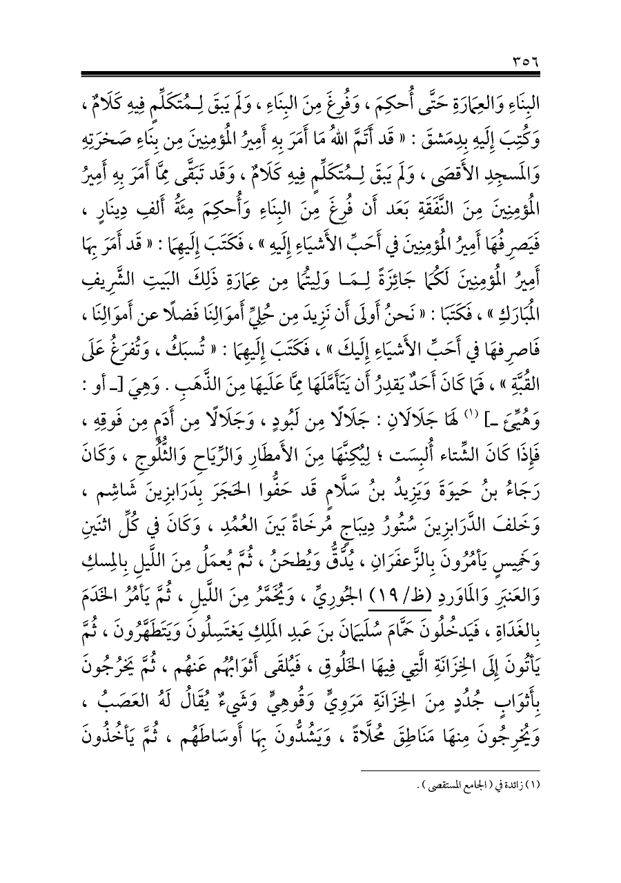 البِنَاءِ وَالعِمَارَةِ حَتَّى أُحكِمَ، وَفُرِغَ مِنَ البِنَاءِ، وَلَم يَبقَ لِمُتَكَلِّمٍ فِيهِ كَلَامٌ، وَكُتِبَ إِلَيهِ بِدِمَشقَ: «قَد أَتَمَّ اللهُ مَا أَمَرَ بِهِ أَمِيرُ المُؤمِنِينَ مِن بِنَاءِ صَخرَتِهِ وَالمَسجِدِ الأَقصَى،