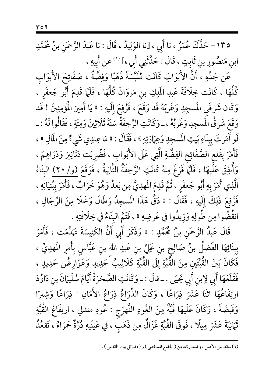 عَن جَدِّهِ، أَنَّ الأَبَوَابَ كَانَت مُلَبَّسَةً ذَهَبًا وَفِضَّةً، صَفَائِحَ الأَبوَابِ كُلِّهَا، كَانَت خِلَافَةَ عَبدِ المَلِكِ بنِ مَروَانَ كُلَّهَا، فَلَمَّا قَدِمَ أَبُو جَعفَرٍ، وَكَان شَرقَيِ المَسجِدِ وَغَربُهُ قَد وَقَعَ، فَرُفِعَ إِلَيهِ: «يَا أَمِيرَ المُؤمِنِينَ! قَد وَقَعَ شَرقُ المَسجِدِ وَغَربُهُ، ـ وَكَانَتِ الرَّجفَةُ سَنَةَ ثَلَاثِينَ وَمِئَةٍ، فَقَالُوا لَهُ: ـ لَو أَمَرتَ بِبِنَاءِ بَيتِ المَسجِدِ وَعِمَارَتِهِ»، فَقَالَ: «مَا عِندِي شَيءٌ مِنَ المَالِ»، فَأَمَرَ بِقَلعِ الصَّفَائِحِ الفِضَّةِ الَّتِي عَلَى الأَبَوابِ، فَضُرِبَت دَنَانِيرَ وَدَرَاهِمَ، وَأُنفِقَ عَلَيهَا، فَلَمَّا فَرَغَ مِنهُ كَانَتِ الرَّجفَةُ الثَّانِيةُ، فَوَقَعَ (و/٢٠) البِنَاءُ الَّذِي أَمَرَ بِهِ أَبُو جَعفَرٍ، ثُمَّ قَدِمَ المَهدِيُّ مِن بَعدُ وَهُوَ خَرَابٌ، فَأَمَرَ بِبُنيَانِهِ، فَرُفِعَ ذَلِكَ إِلَيهِ، فَقَالَ: «دَقَّ هَذَا المَسجِدُ وَطَالَ وَخَلَا مِنَ الرِّجَالِ، انقُضُوا مِن طُولِهِ وَزِيدُوا في عَرضِهِ»، فَتَمَّ البِنَاءُ في خِلَافَتِهِ.