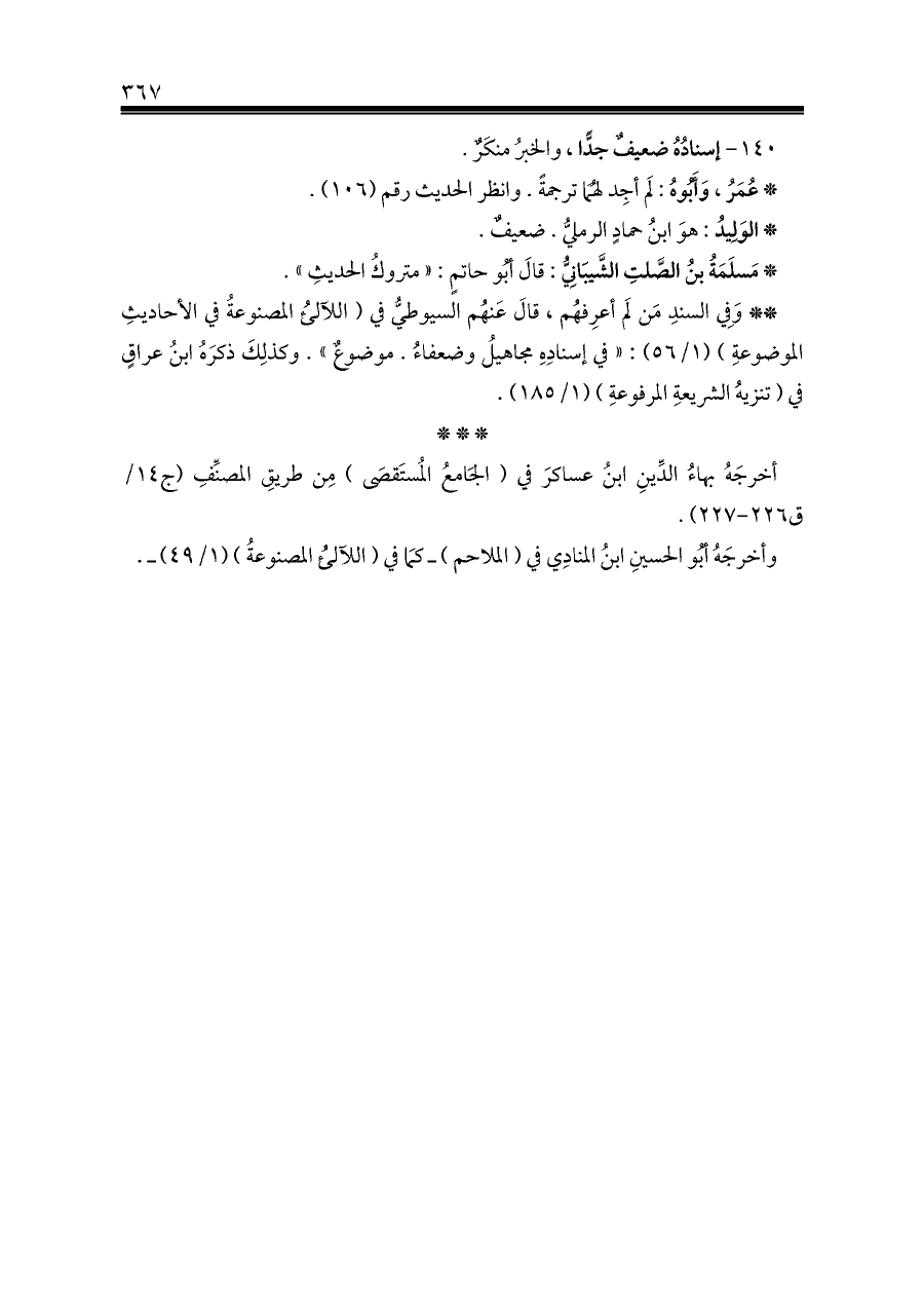 ** وَفِي السندِ مَن لَم أعرِفهُم، قالَ عَنهُم السيوطيُّ في (اللآلئُ المصنوعةُ في الأحاديثِ الموضوعةِ) (١/ ٥٦): «في إسنادِهِ مجاهيلُ وضعفاءُ. موضوعٌ». وكذلِكَ ذكرَهُ ابنُ عراقٍ في (تنزيهُ الشريعةِ المرفوعةِ) (١/ ١٨٥).