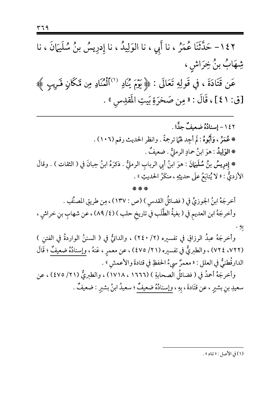 ١٤٢ - إسنادُهُ ضعيفٌ جدًّا.