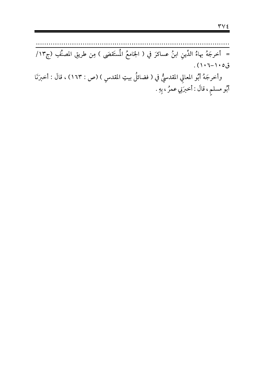 وأخرجَهُ أبُو المعالِي المقدسيُّ في (فضائلُ بيتِ المقدسِ) (ص: ١٦٣)، قالَ: أخبرَنَا أبُو مسلمٍ، قالَ: أخبرَنِي عمرُ، بِهِ.