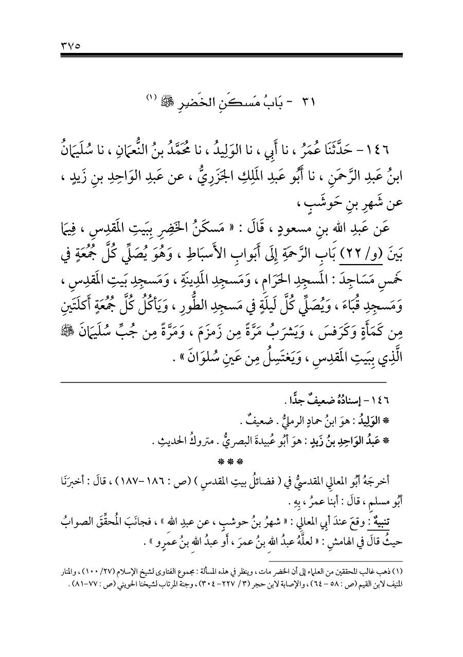 عَن عَبدِ اللهِ بنِ مسعودٍ، قَالَ: «مَسكَنُ الخَضِرِ بِبَيتِ المَقدِسِ، فِيمَا بَينَ (و/٢٢) بَابِ الرَّحمَةِ إِلَى أَبَوابِ الأَسبَاطِ، وَهُوَ يُصَلِّي كُلَّ جُمُعَةٍ في خَمسِ مَسَاجِدَ: المَسجِدِ الحَرَامِ، وَمَسجِدِ المَدِينَةِ، وَمَسجِدِ بَيتِ المَقدِسِ، وَمَسجِدِ قُبَاءَ، وَيُصَلِّي كُلَّ لَيلَةٍ في مَسجِدِ الطُّورِ، وَيَأكُلُ كُلَّ جُمُعَةٍ أَكلَتَينِ مِن كَمَأَةٍ وَكَرَفسَ، وَيَشرَبُ مَرَّةً مِن زَمزَمَ، وَمَرَّةً مِن جُبِّ سُلَيمَانَ - صلى الله عليه وسلم - الَّذِي بِبَيتِ المَقدِسِ، وَيَغتَسِلُ مِن عَينِ سُلوَانَ».