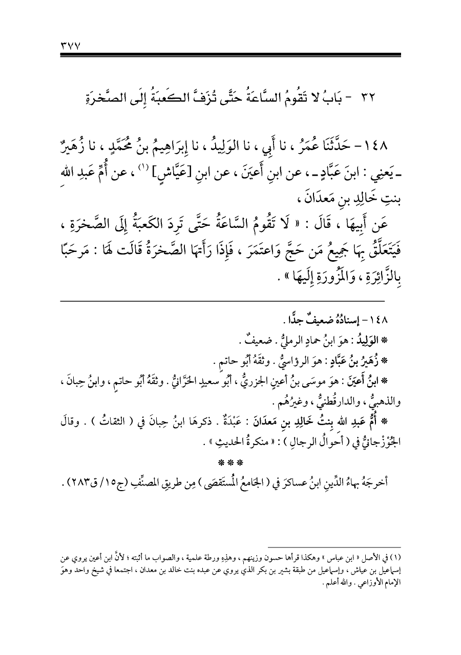(¬١) في الأصل «ابن عباس» وهكذا قرأها حسون وزينهم، وهذِهِ ورطة علمية، والصواب ما أثبته؛ لأنَّ ابن أعين يروي عن إسماعيل بن عياش، وإسماعيل من طبقة بشير بن بكر الذي يروي عن عبده بنت خالد بن معدان، اجتمعا في شيخ واحد وهوَ الإمام الأوزاعي. والله أعلم.