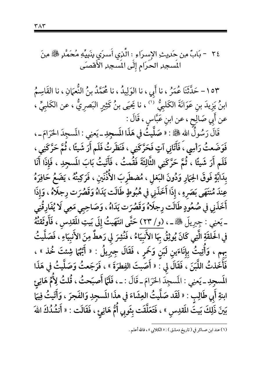 قَالَ رَسُولُ اللهِ - صلى الله عليه وسلم -: «صَلَّيتُ في هَذَا المَسجِدِ ـ يَعنِي: المَسجِدَ الحَرَامَ ـ، فَوَضَعتُ رَأسِي، فَأَتَانِي آتٍ فَحَرَّكَنِي، فَنَظَرتُ فَلَم أَرَ شَيئًا، ثُمَّ حَرَّكَنِي، فَلَم أَرَ شَيئًا، ثُمَّ حَرَّكَنِي الثَّالِثَةَ فَقُمتُ، فَأَتَيتُ بَابَ المَسجِدِ، فَإِذَا أَنَا بِدَابَّةٍ فَوقَ الحِمَارِ وَدُونَ البَغلِ، مُضطَرِبَ الأُذُنَينِ، فَرَكِبتُهُ، يَضَعُ حَافِرَهُ عِندَ مُنتَهَى بَصَرِهِ، إِذَا أَخَذَنِي في هُبُوطٍ طَالَت يَدَاهُ وَقَصُرَت رِجلَاهُ، وَإِذَا أَخَذَنِي في صُعُودٍ طَالَت رِجلَاهُ وَقَصُرَت يَدَاهُ، وَصَاحِبِي مَعِي لَا يُفَارِقُنِي ـ يَعنِي: جِبرِيلَ - صلى الله عليه وسلم - ـ، (و/٢٣) حَتَّى انتَهَيتُ إِلَى بَيتِ المَقدِسِ، فَأَوثَقتُهُ في الحَلقَةِ الَّتِي كَانَ يُوثِقُ بِهَا الأَنبِيَاءُ، فَنُشِرَ لِي رَهطٌ مِنَ الأَنبِيَاءِ، فَصَلَّيتُ بِهِم، وَأُتِيتُ بِإِنَاءَينِ لَبَنٍ وَخَمرٍ، فَقَالَ جِبرِيلُ: «أَيَّهُمَا شِئتَ خُذ»، فَأَخَذتُ اللَّبَنَ، فَقَالَ لِي: «أَصَبتَ الفِطرَةَ»، فَرَجَعتُ وَصَلَّيتُ في هَذَا المَسجِدِ ـ يَعنِي: المَسجِدَ الحَرَامَ ـ قَالَ: ـ، فَلَمَّا أَصبَحتُ، قُلتُ لِأُمِّ هَانِئٍ ابنةِ أَبِي طَالِبٍ: «لَقَد صَلَّيتُ العِشَاءَ في هذَا المَسجِدِ وَالفَجرَ، وَأَتَيتُ فِيمَا بَينَ ذَلِكَ بَيتَ المَقدِسِ»، فَتَعَلَّقَت بِثَوبِي أُمُّ هَانِئٍ، فَقَالَت: «أَنشُدُكَ اللهَ