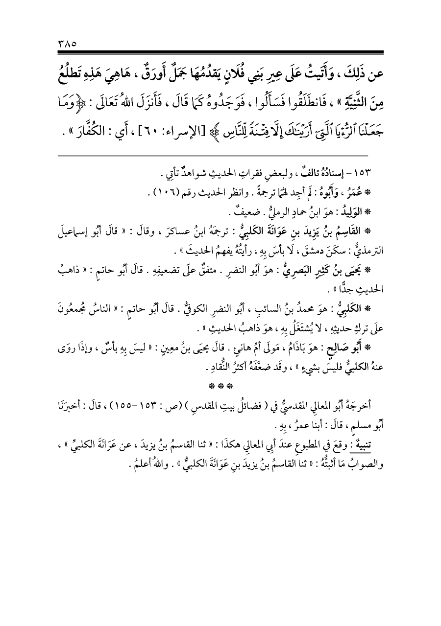 ١٥٣ - إسنادُهُ تالفٌ، ولبعضِ فقراتِ الحديثِ شواهدٌ تأتِي.