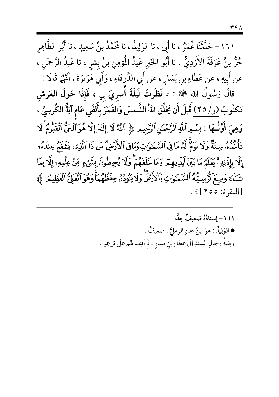 قالَ رَسُولُ اللهِ - صلى الله عليه وسلم -: «نَظَرتُ لَيلَةَ أُسرِيَ بِي، فَإِذَا حَولَ العَرشِ مَكتُوبٌ (و/٢٥) قَبلَ أَن يَخلُقَ اللهُ الشَّمسَ وَالقَمَرَ بِأَلفَي عَامٍ آيَةُ الكُرسِيِّ، وَهِيَ أَوَّلُهَا: بِسْمِ اللَّهِ الرَّحْمَنِ الرَّحِيمِ {اللَّهُ لَا إِلَهَ إِلَّا هُوَ الْحَيُّ الْقَيُّومُ لَا تَأْخُذُهُ سِنَةٌ وَلَا نَوْمٌ لَهُ مَا فِي السَّمَاوَاتِ وَمَا فِي الْأَرْضِ مَنْ ذَا الَّذِي يَشْفَعُ عِنْدَهُ إِلَّا بِإِذْنِهِ يَعْلَمُ مَا بَيْنَ أَيْدِيهِمْ وَمَا خَلْفَهُمْ وَلَا يُحِيطُونَ بِشَيْءٍ مِنْ عِلْمِهِ إِلَّا بِمَا شَاءَ وَسِعَ كُرْسِيُّهُ السَّمَاوَاتِ وَالْأَرْضَ وَلَا يَئُودُهُ حِفْظُهُمَا وَهُوَ الْعَلِيُّ الْعَظِيمُ} [البقرة: ٢٥٥]».