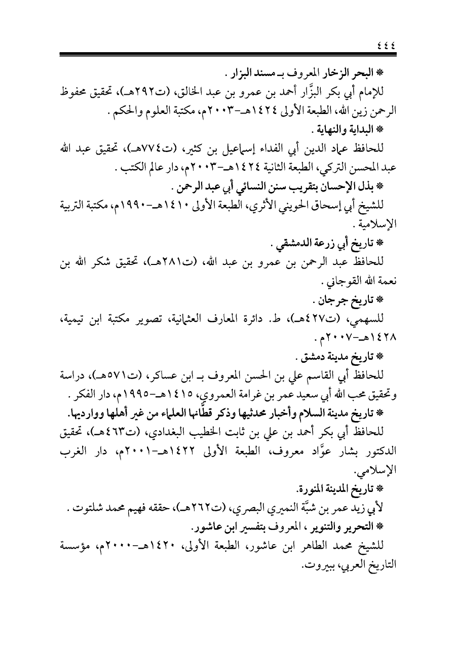 للحافظ عماد الدين أبي الفداء إسماعيل بن كثير، (ت ٧٧٤ هـ)، تحقيق عبد الله ... عبد المحسن التركي، الطبعة الثانية ١٤٢٤ هـ-٢٠٠٣ م، دار عالم الكتب.
