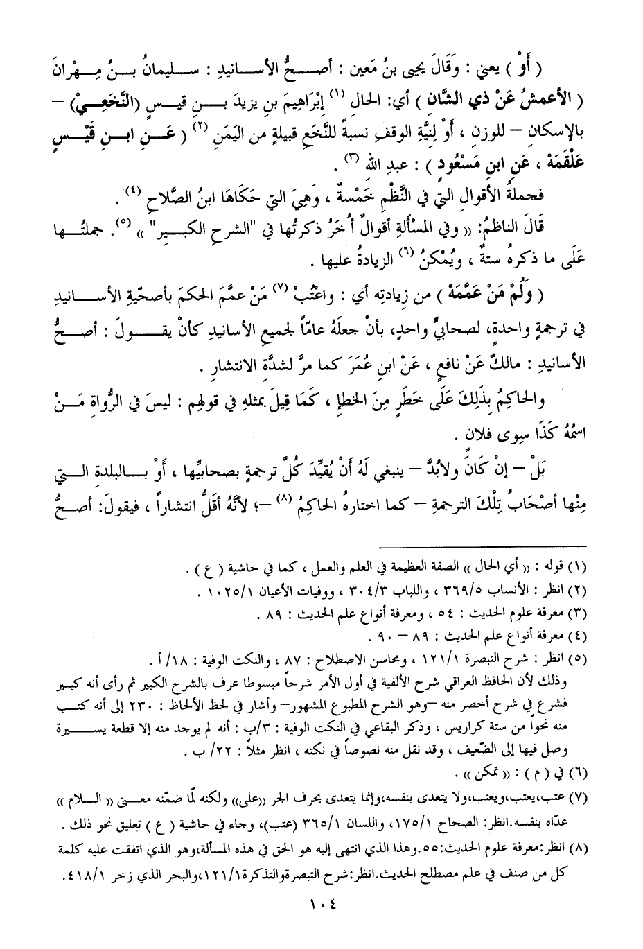 (¬8) انظر: معرفة علوم الحديث: 55. وهذا الذي انتهى إليه هو الحق في هذه المسألة، وهو الذي اتفقت عليه كلمة كل من صنف في علم مصطلح الحديث. انظر: شرح التبصرةوالتذكرة1/ 121، والبحر الذي زخر 1/ 418.