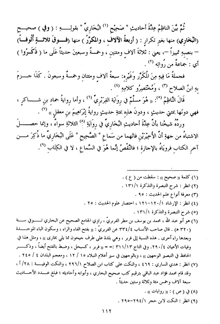 قَالَ النَّاظِمُ (¬5): ((هُوَ مسلَّمٌ في رِوَايَة الفِرَبْرِيِّ (¬6)، وأما رِوايةُ حمادِ بنِ شاكرٍ، فهي دونَها بمئتي حديثٍ، ودونَ هذِهِ بمئةِ حديثٍ روايةُ إِبْرَاهِيمَ بنِ معقلٍ)) (¬7).