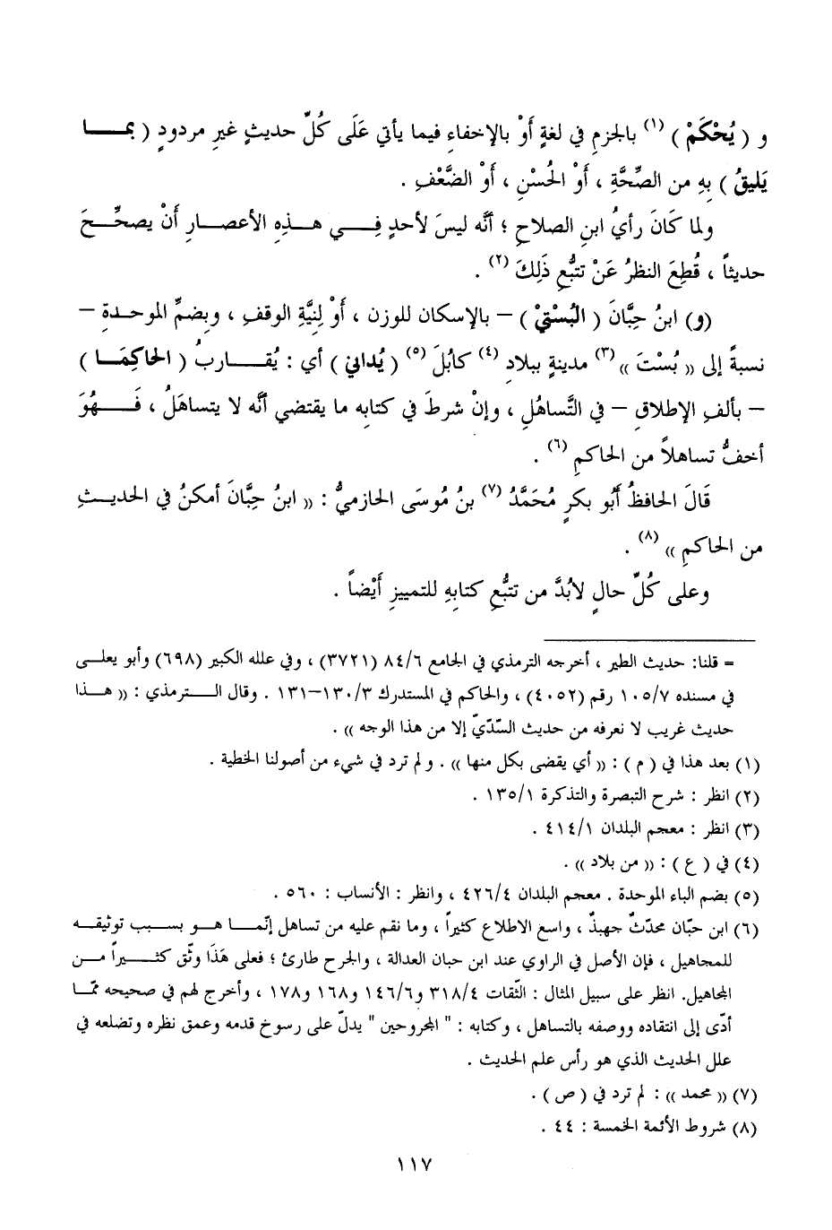 (¬6) ابن حبّان محدّثٌ جهبذٌ، واسع الاطلاع كثيراً، وما نقم عليه من تساهل إنّما هو بسبب توثيقه للمجاهيل، فإن الأصل في الراوي عند ابن حبان العدالة، والجرح طارئ؛ فعلى هَذَا وثّق كثيراً من المجاهيل. انظر على سبيل المثال: الثّقات 4/ 318 و6/ 146 و168 و178، وأخرج لهم في صحيحه ممّا أدّى إلى انتقاده ووصفه بالتساهل، وكتابه: " المجروحين " يدلّ على رسوخ قدمه وعمق نظره وتضلعه في علل الحديث الذي هو رأس علم الحديث.