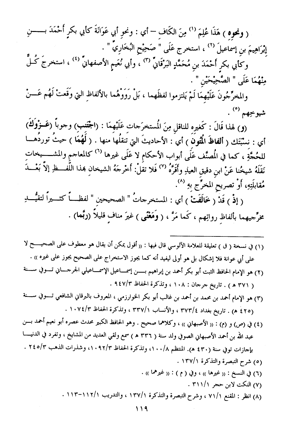 (¬1) في نسخة (ق) تعليقة للعلامة الآلوسي قال فيها: ((أقول يمكن أن يقال هو معطوف على الصحيح لا على أبي عوانة فلا إشكال بل هو أولى ليفيد أنه كما يجوز الاستخراج على الصحيح يجوز على غيره)).