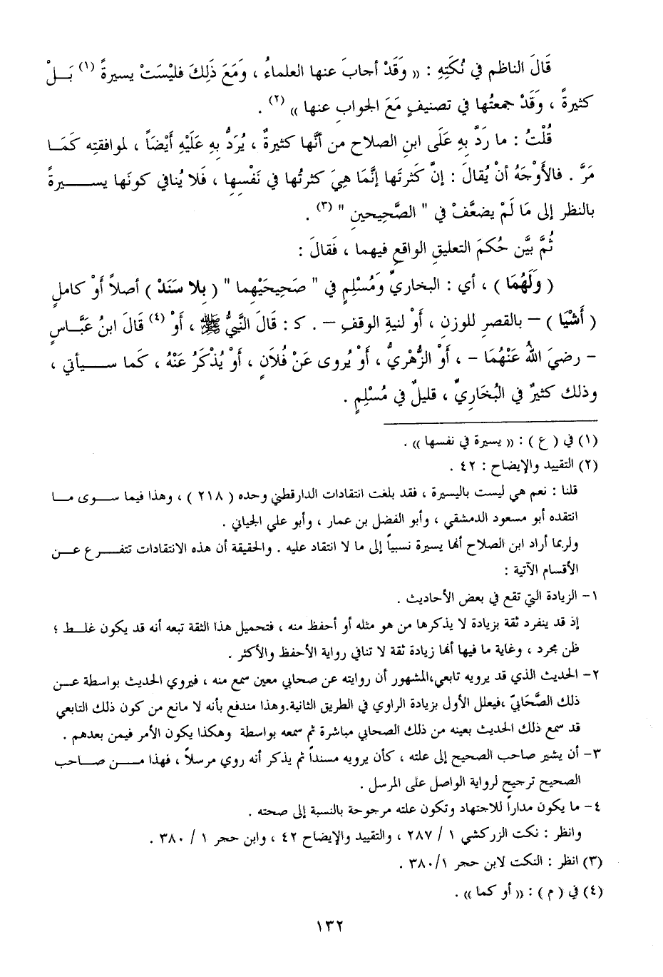 قُلْتُ: ما رَدَّ بِهِ عَلَى ابنِ الصلاح من أنَّها كثيرةٌ، يُرَدُّ بِهِ عَلَيْهِ أَيْضَاً، لموافقتِه كَمَا مَرَّ. فالأَوْجَهُ أنْ يُقالَ: إنَّ كَثرتَها إنَّمَا هِيَ كثرتُها في نَفْسِهِا، فَلا يُنافي كونَها يسيرةً بالنظر إلى مَا لَمْ يضعَّفْ في " الصَّحِيحينِ " (¬3).