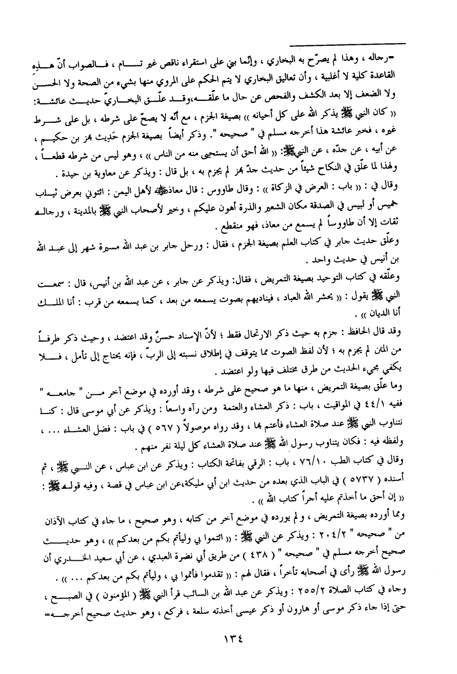 ((كان النبي - صلى الله عليه وسلم - يذكر الله على كل أحيانه)) بصيغة الجزم، مع أنّه لا يصحّ على شرطه، بل على شرط غيره، فخبر عائشة هذا أخرجه مسلم في " صحيحه ". وذكر أيضاً بصيغة الجزم حَدِيث بهز بن حكيم، عن أبيه، عن جدّه، عن النبي - صلى الله عليه وسلم -: ((الله أحق أن يستحيى منه من الناس))، وهو ليس من شرطه قطعاً، ولهذا لما علّق في النكاح شيئاً من حديث جدّ بهز لم يجزم به، بل قال: ويذكر عن معاوية بن حيدة.
