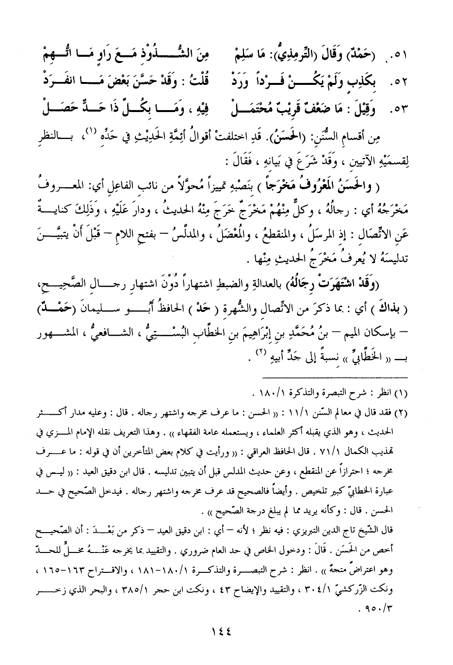 مِن أقسامِ السُّنَنِ: (الحَسَنُ). قَدِ اختلفتْ أقوالُ أئِمَّةِ الحَدِيْثِ في حَدِّهِ (¬1)، بالنظرِ لِقسمَيْهِ الآتيينِ، وَقَدْ شَرَعَ في بَيانِهِ، فَقَالَ:
