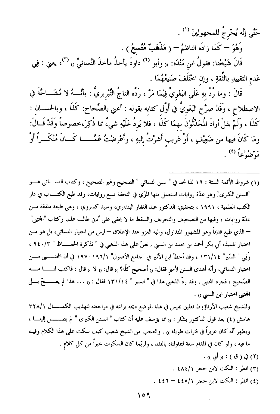 (¬1) شروط الأئمة الستة: 19 لذا نجد في " سنن النسائي " الصحيح وغير الصحيح، وكتاب النسائي هو "السنن الكبرى" وهو عدّة روايات استعمل منها المزّي في التحفة تسع روايات، وقد طبع الكتاب في دار الكتب العلمية، 1991، بتحقيق: الدكتور عبد الغفار البنداري، وسيد كسروي، وهي طبعة ملفقة من عدّة روايات، وفيها من التصحيف والتحريف والسقط ما لا يخفى على أدنى طالب علم. وكتاب "المجتبى" - الذي طبع قديماً وهو المشهور المتداول، وإليه العزو عند الإطلاق - ليس من اختيار النسائي، بل هو من اختيار تلميذه أبي بكر أحمد بن محمد بن السني. نصّ على هذا الذهبي في " تذكرة الحفاظ " 3/ 940، وَفِي " السّير" 14/ 131، وقد أخطأ ابن الأثير في "جامع الأصول" 1/ 196 - 197 في أن المجتبى من اختيار النسائي، وأنّه أهدى السنن لأميرٍ فقال: ((أصحيح كلّه؟)) قال: ((لا)) قال: فاكتب لنا منه الصّحيح، فجرد المجتبى. وقد ردّ الذهبي هذا في " السير " 14/ 131 فقال: (( ... هذا لم يصحّ بل المجتبى اختيار ابن السني)).