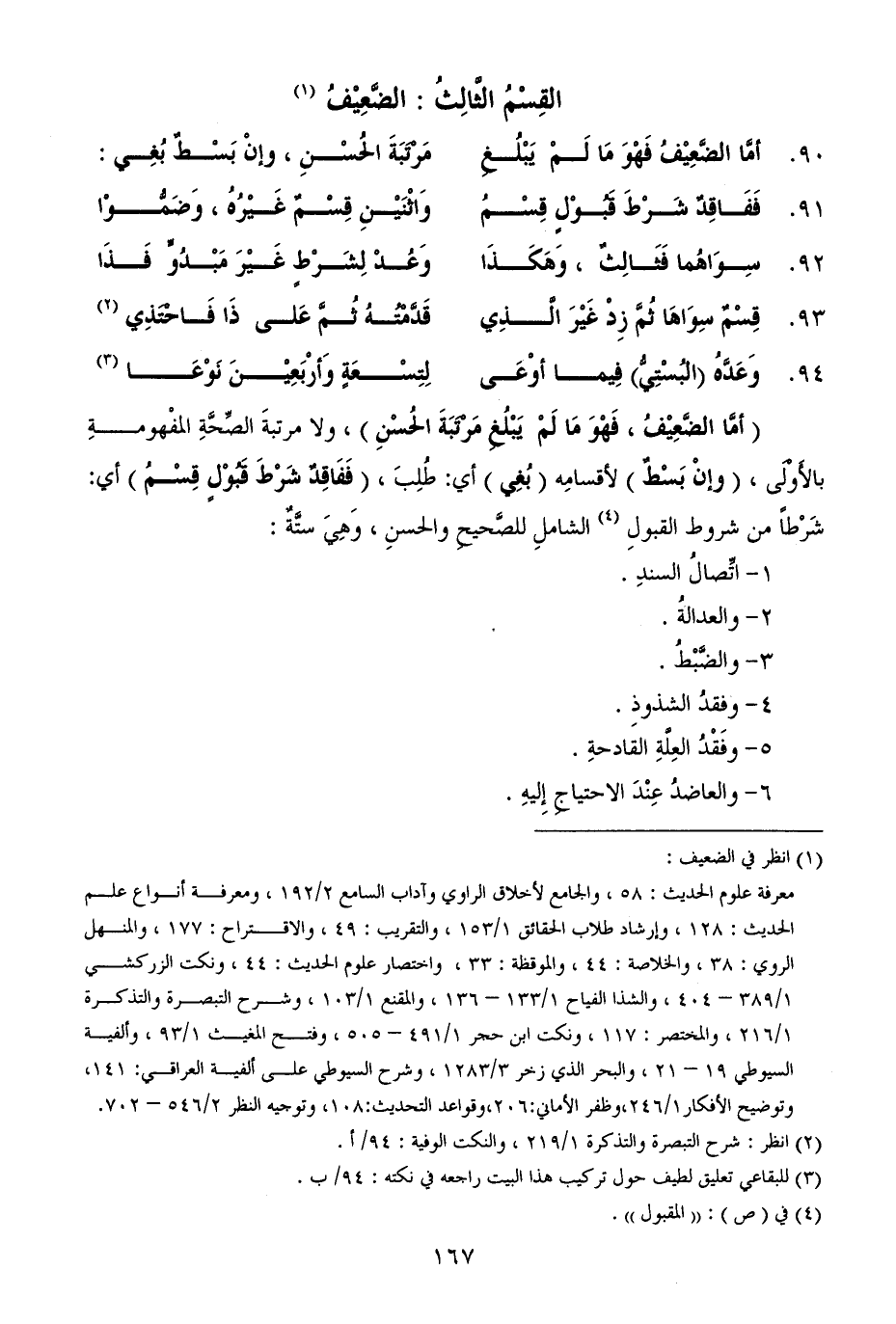 (أمَّا الضَّعِيْفُ، فَهْوَ مَا لَمْ يَبْلُغِ مَرْتَبَةَ الحُسْنِ)، ولا مرتبةَ الصِّحَّةِ المفْهومةِ بالأَوْلَى، (وإنْ بَسْطٌ) لأقسامِه (بُغِي) أي: طُلِبَ، (فَفَاقِدٌ شَرْطَ قَبُوْلٍ قِسْمُ) أي: شَرْطاً من شروط القبولِ (¬4) الشاملِ للصَّحيحِ والحسنِ، وَهِيَ ستَّةٌ: