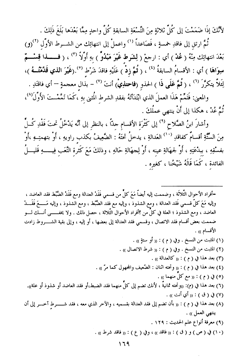 = أفراد الأحوال الثَّلاثَة، وضممت إليه أيضاً مَعَ كلٍّ من قسمي فَقَدْ العدالة ومع فَقَدْ الضَّبْط فقد العاضد، وإليه مَعَ كلّ قسمي فَقد العدالة، ومع الشذوذ، وإليه مع فقد الضَّبْط، ومع الشذوذ، وإليه مَعَ فَقَدْ العاضد، ومع الشذوذ؛ العلة في كلٍّ من؟ أفراد الأحوال الثّلاثة، حصل ذلك. ولا يخفى أنك لو ضممت بعض أقسام فقد الاتصال، وقسمي فقد العدالة إلى بعضها، أو إليه، وإلى بقية الشروط زادت الأقسام)).
