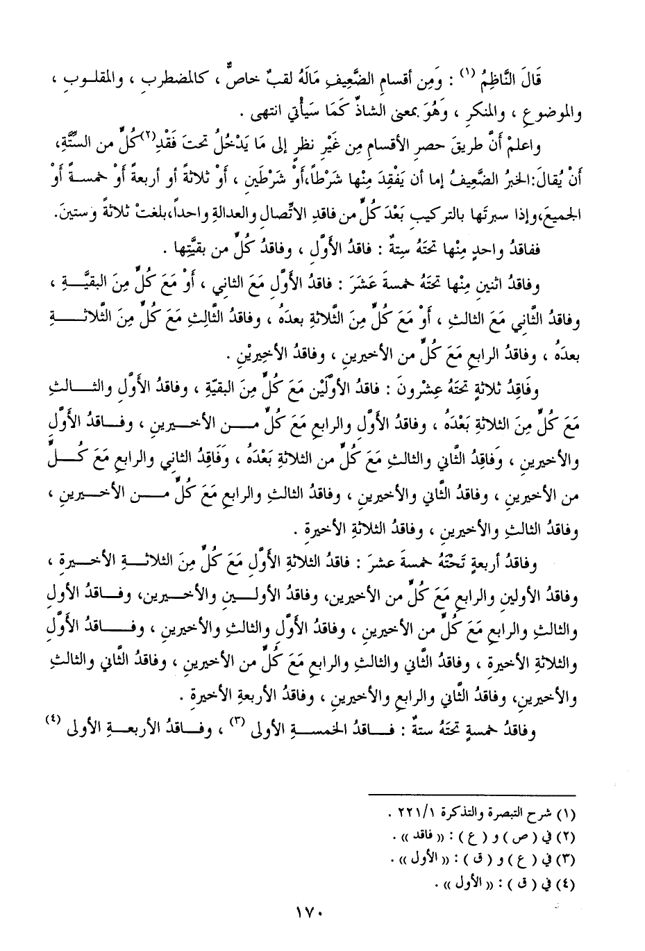 وفاقدُ أربعةٍ تَحْتَهُ خمسةَ عشرَ: فاقدُ الثلاثةِ الأَوَّلِ مَعَ كُلٍّ مِنَ الثلاثةِ الأخيرةِ، وفاقدُ الأولينِ والرابعِ مَعَ كُلٍّ من الأخيرين، وفاقدُ الأولينِ والأخيرين، وفاقدُ الأولِ والثالثِ والرابعِ مَعَ كُلٍّ من الأخيرينِ، وفاقدُ الأَوَّلِ والثالثِ والأخيرينِ، وفاقدُ الأَوَّلِ والثلاثةِ الأخيرةِ، وفاقدُ الثَّاني والثالثِ والرابعِ مَعَ كُلٍّ من الأخيرينِ، وفاقدُ الثَّاني والثالثِ والأخيرينِ، وفاقدُ الثَّاني والرابعِ والأخيرينِ، وفاقدُ الأربعةِ الأخيرةِ.