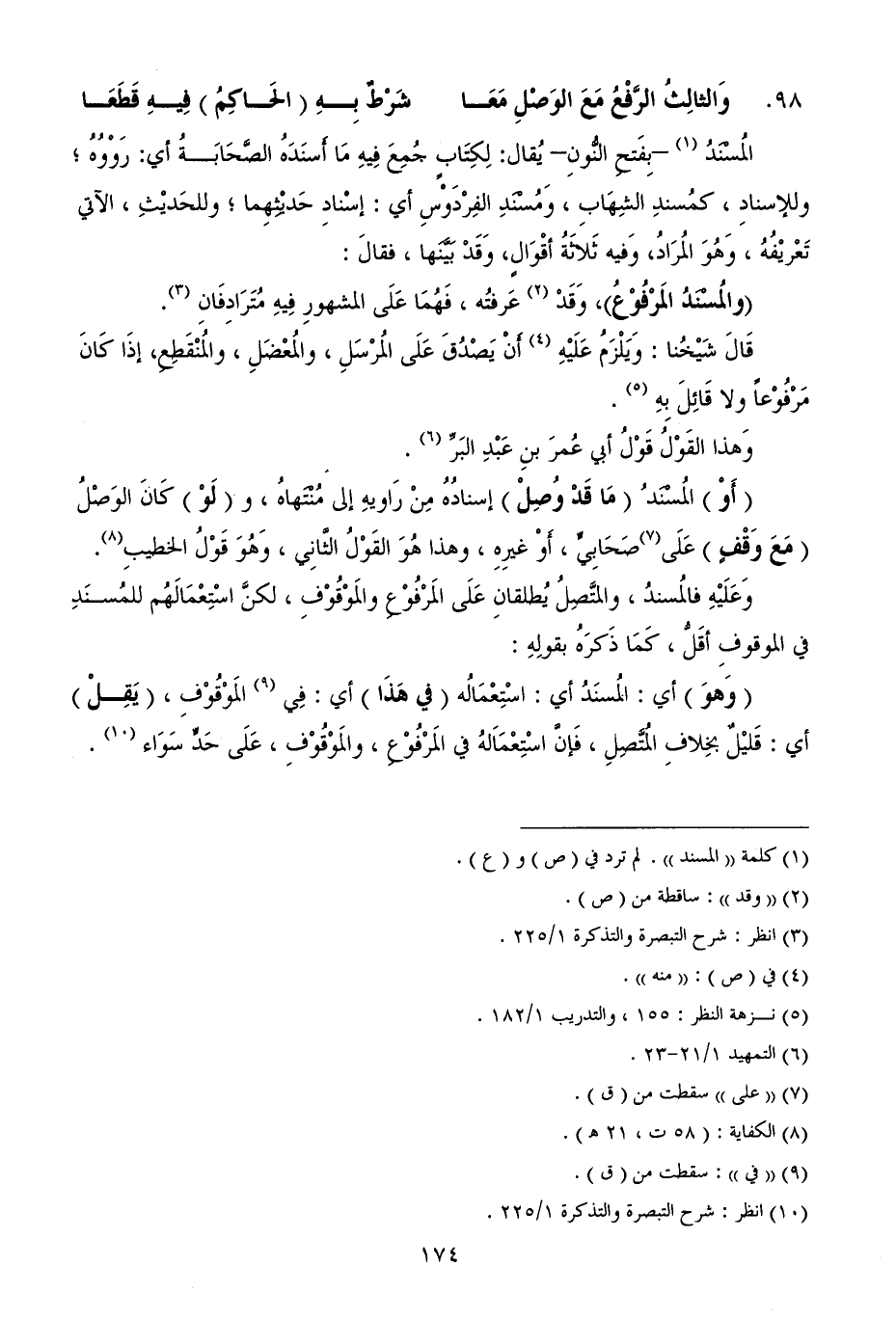 وَعَلَيْهِ فالمُسندُ، والمتَّصِلُ يُطلقانِ عَلَى المَرْفُوْعِ والمَوْقُوْفِ، لكنَّ اسْتِعْمَالَهُم للمُسنَدِ في الموقوفِ أقَلُّ، كَمَا ذَكرَهُ بقولِهِ: