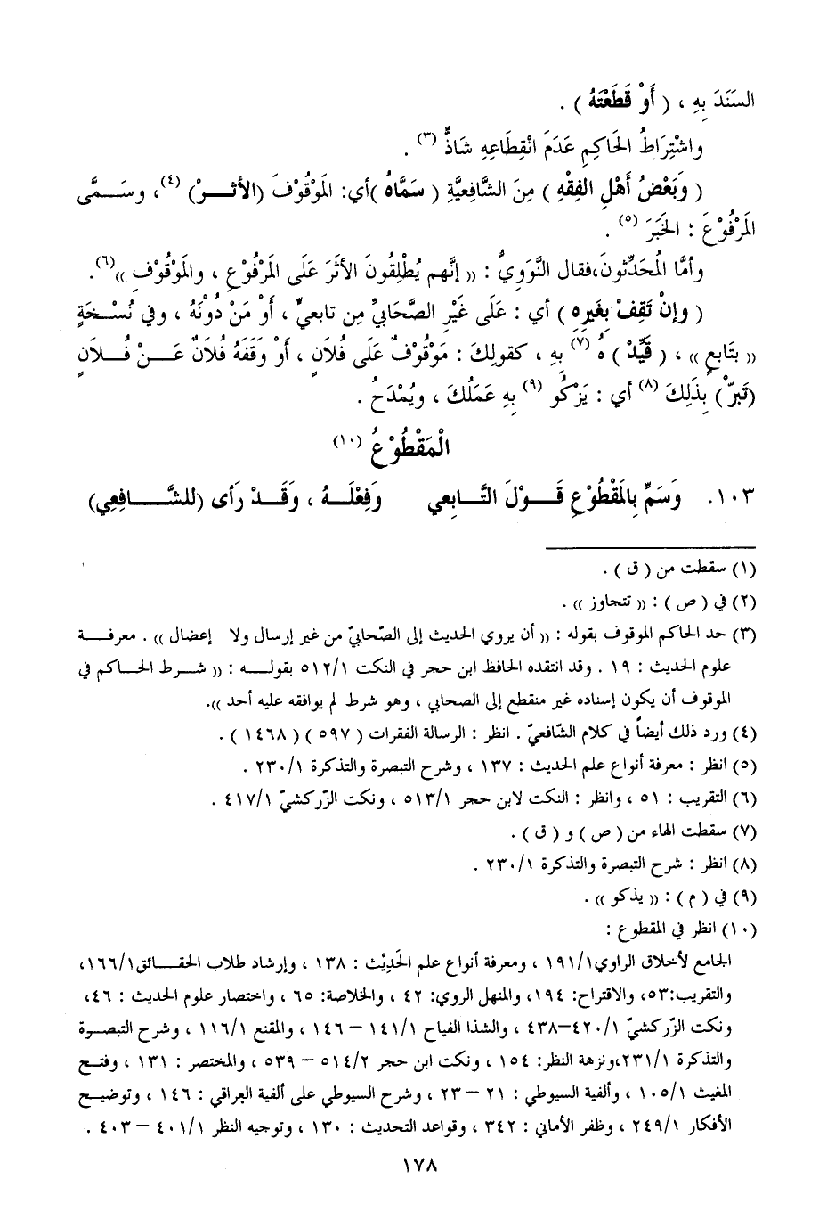 (¬1) حد الحاكم الموقوف بقوله: ((أن يروي الحديث إلى الصّحابيّ من غير إرسال ولا إعضال)). معرفة علوم الحديث: 19. وقد انتقده الحافظ ابن حجر في النكت 1/ 512 بقوله: ((شرط الحاكم في الموقوف أن يكون إسناده غير منقطع إلى الصحابي، وهو شرط لم يوافقه عليه أحد)).